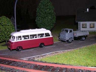 Das Fahrgestell des W50 ist von SES und der Dreiseitenkipper-Aufbau ein Bausatz von Modellbahn-Kreativ. Der Robur-Bus kommt, wie auch der Garant, aus dem Hause BeKa.