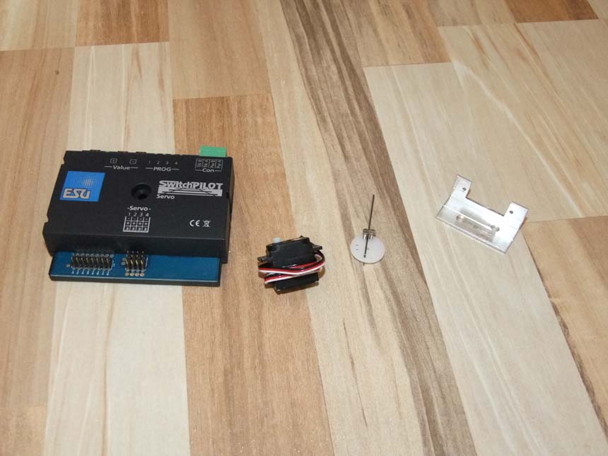 Für den Antrieb einer Weiche werden ein Servo-Decoder ein Stück Aluminiumwinkel ein paar Schrauben,etwas Stahldraht 1mm und natürlich ein Servo mit rundem Ruderhorn benötigt. Der Decoder, in meinem Fall ein "ESU Switch Pilot Servo", ist zur Steuerung von bis zu vier Servos ausgelegt.