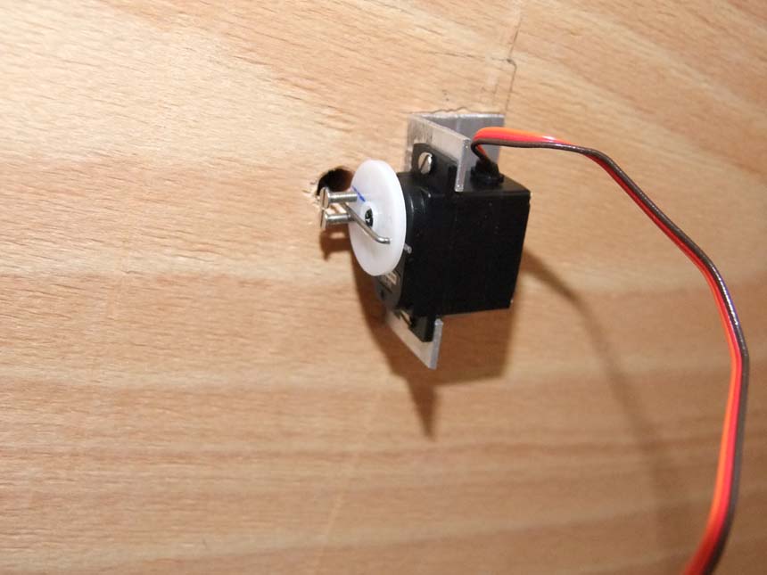 Das Servo wird in den ausgeschnittenen Alu-Winkel eingeschraubt und genau unter der Weiche befestigt. Natürlich muss man bereits lange vorher, beim Verlegen der Weichen, an ein Loch unter der Weichenstellzunge denken. Durch dieses Loch schiebt man den 1mm Stahldraht, welcher an dem Servohorn befestigt ist. Der Draht muss nun noch in das kleine Loch in der Stellzunge der Weiche eingefädelt werden.